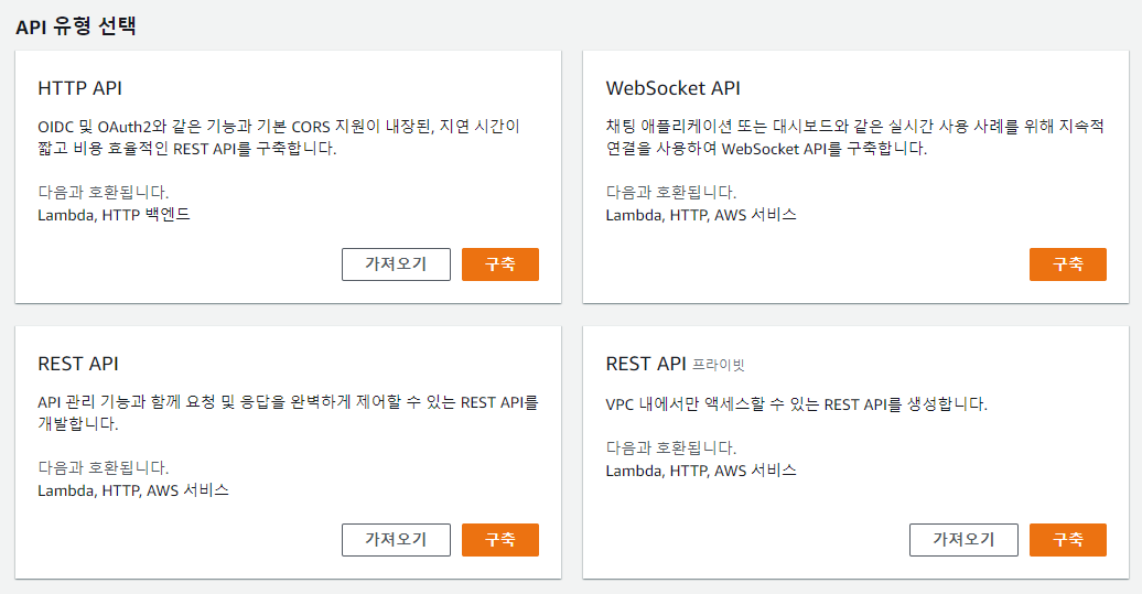 API 생성을 누르면 총 4가지의 유형이 나오는데요,
