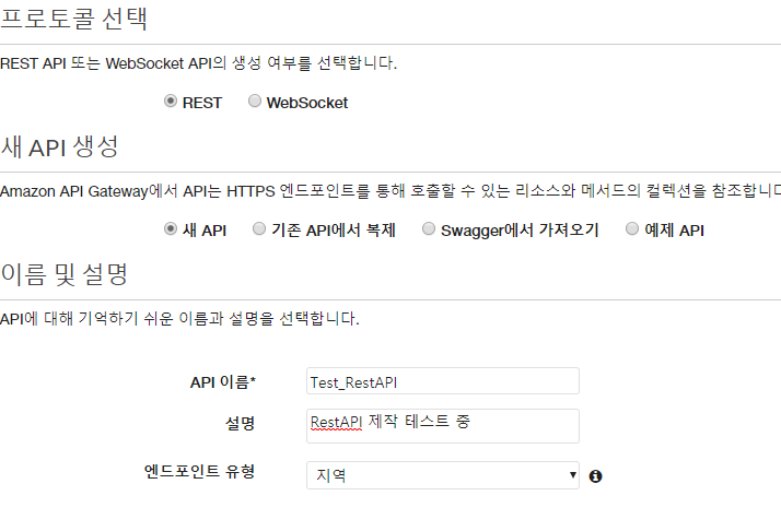 엔드포인트 유형으로는 지역으로 설정하여 API 생성을 마무리합니다.